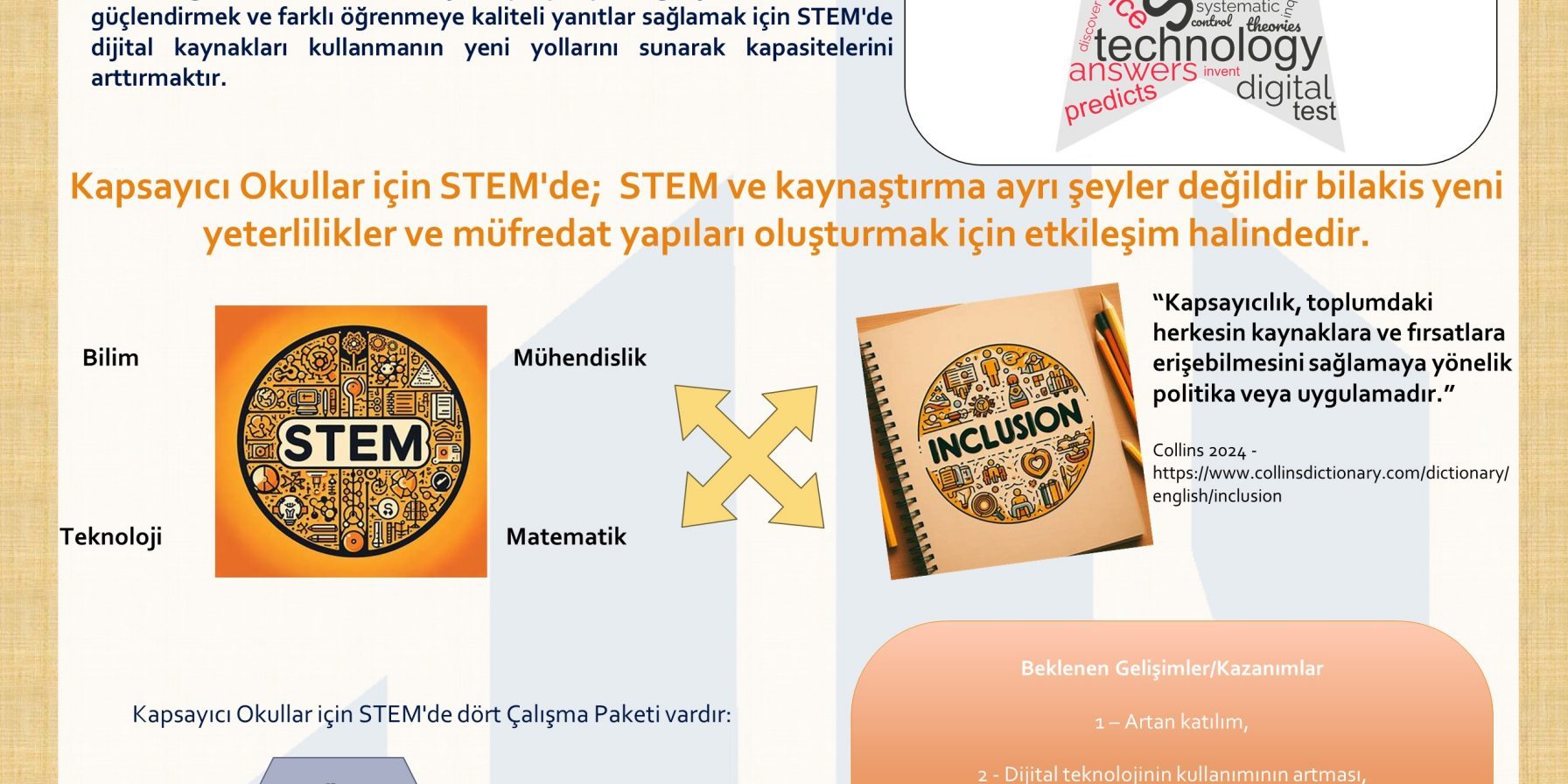 Kapsayıcı okullar için STEM ERASMUS+ projesi, sınıf ortamlarını ve dijital araçları kullanarak STEM’i okul eğitimine entegre etmenin kapsayıcı yollarına odaklanıyor. ERASMUS+ programının okul eğitimi alanında yer almakta olup proje süresi 36 aydır. Proje dili İngilizcedir.