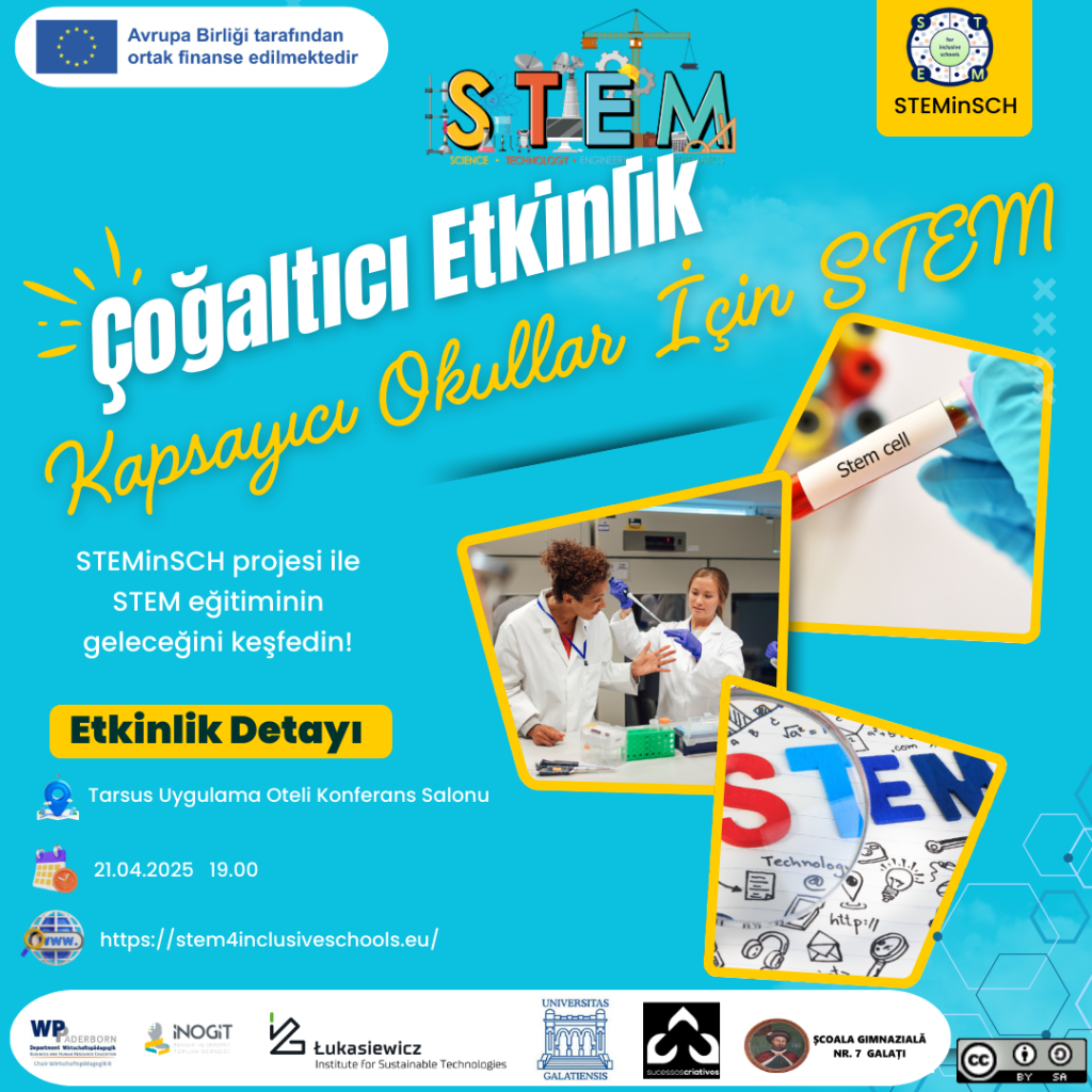 Erasmus+ programı çerçevesinde Paderborn Üniversitesi koordinatörlüğünde yürütülen ve Türkiye ortağı olarak yer aldığımız, “STEM for inclusive schools – Kapsayıcı okullar için STEM” projemizin ilk iş paketi kapsamında üretilen STEM ders aktivitelerinin tanıtılmasını ve ilgili hedef grup öğretmenler tarafından kullanımını teşvik etmek amacıyla düzenleyeceğimiz çoğaltıcı etkinliğimize bekleriz. Ayrıca, projeyle ilgili daha fazla bilgiye proje web sitesinden ulaşılabilir: https://stem4inclusiveschools.eu/